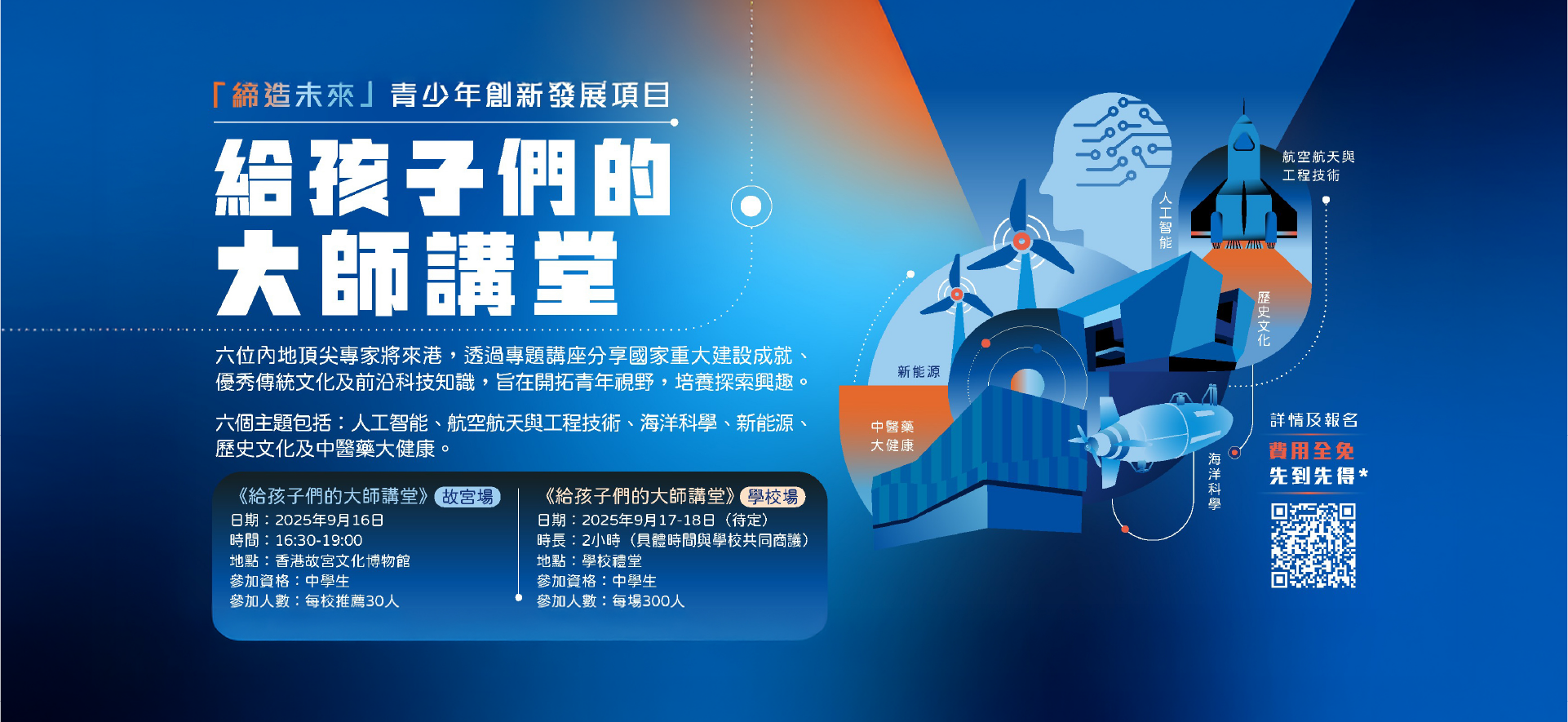 六個主題包括:人工智慧、航空航太與工程技術、海洋科學、新能源、歷史文化、中醫藥大健康。