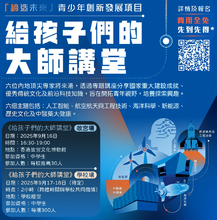 由內地頂尖專家來港,透過專題講座,分享國家重大建設成就、優秀傳統文化及前沿科技知識,旨在開拓青年視野,培育探索興趣。